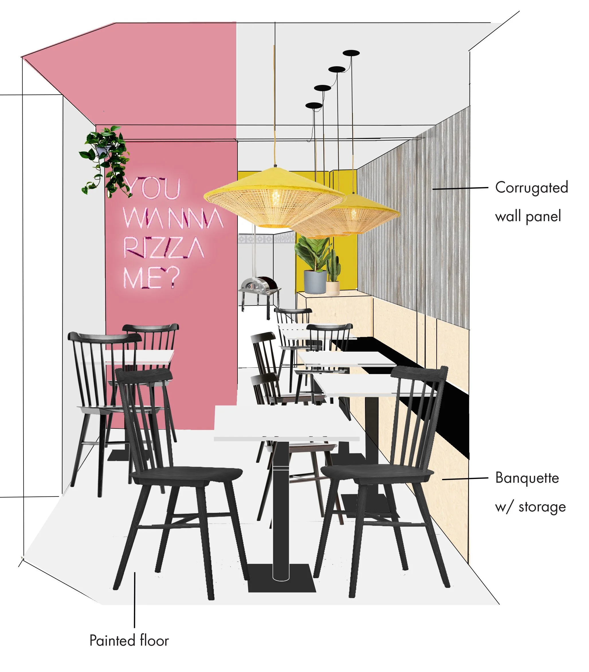Feasibility and concept design for an independent pizza restaurant in Whitstable, Kent. The historic site was very tight with a challenging layout internally. The scope included site survey, space plan to maximise covers, liaison with the pizza-oven manufacturers to ascertain the ideal layout, working with the client on the look and feel.